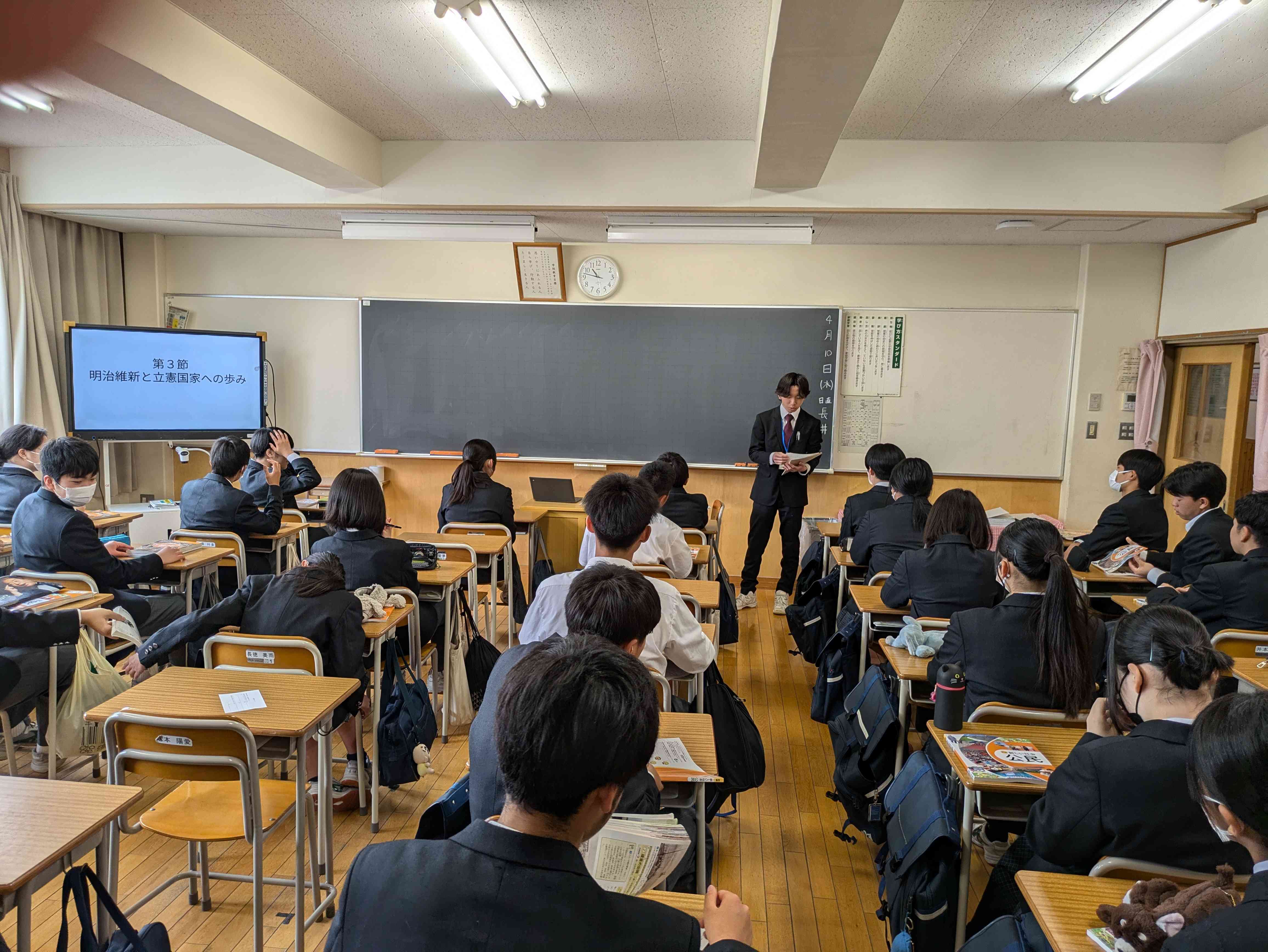 3校時、3年生社会科の授業にお邪魔しました。 3年になって、初めての授業のため、授業の進め方や授業内評価について説明しています。