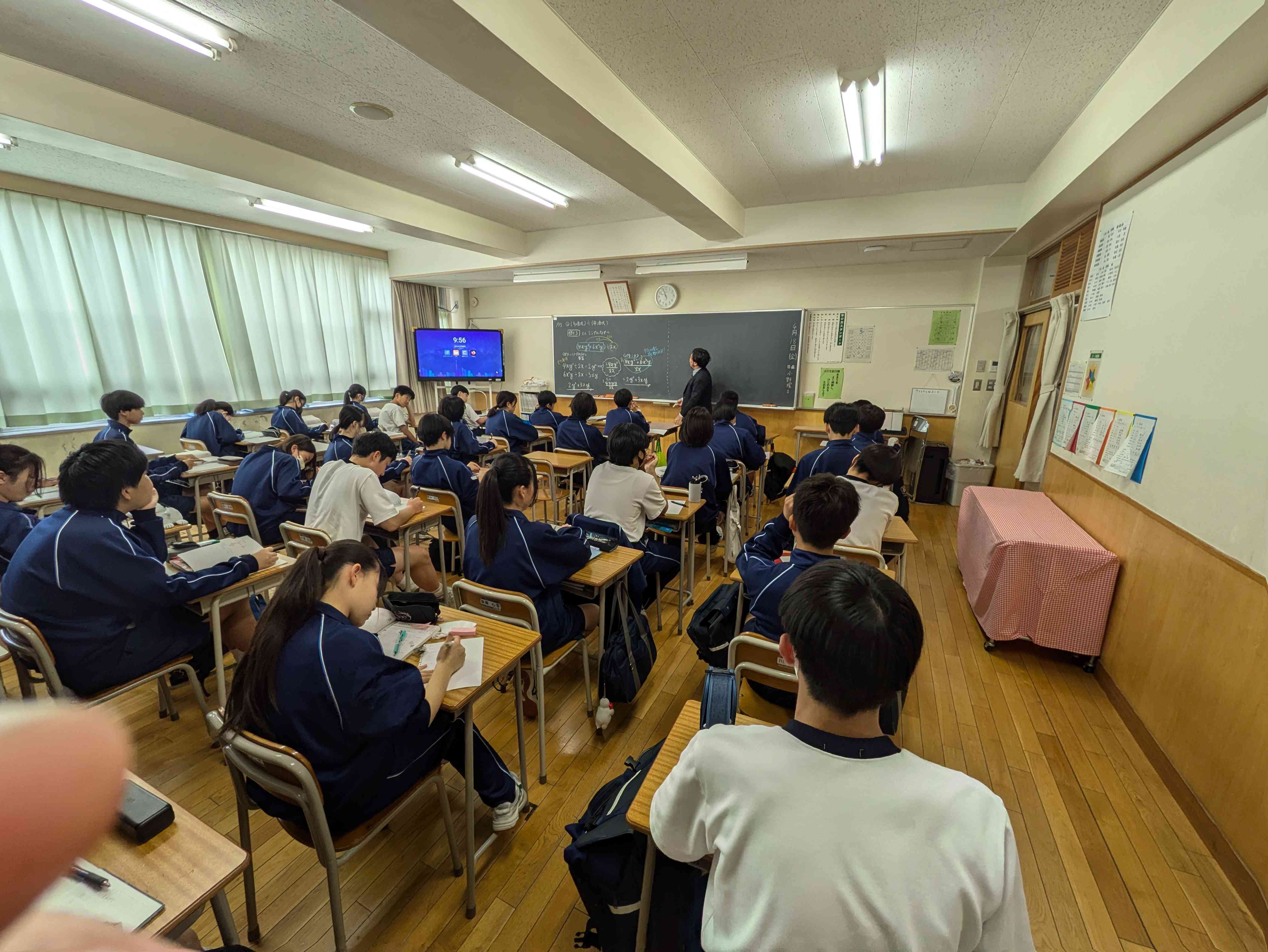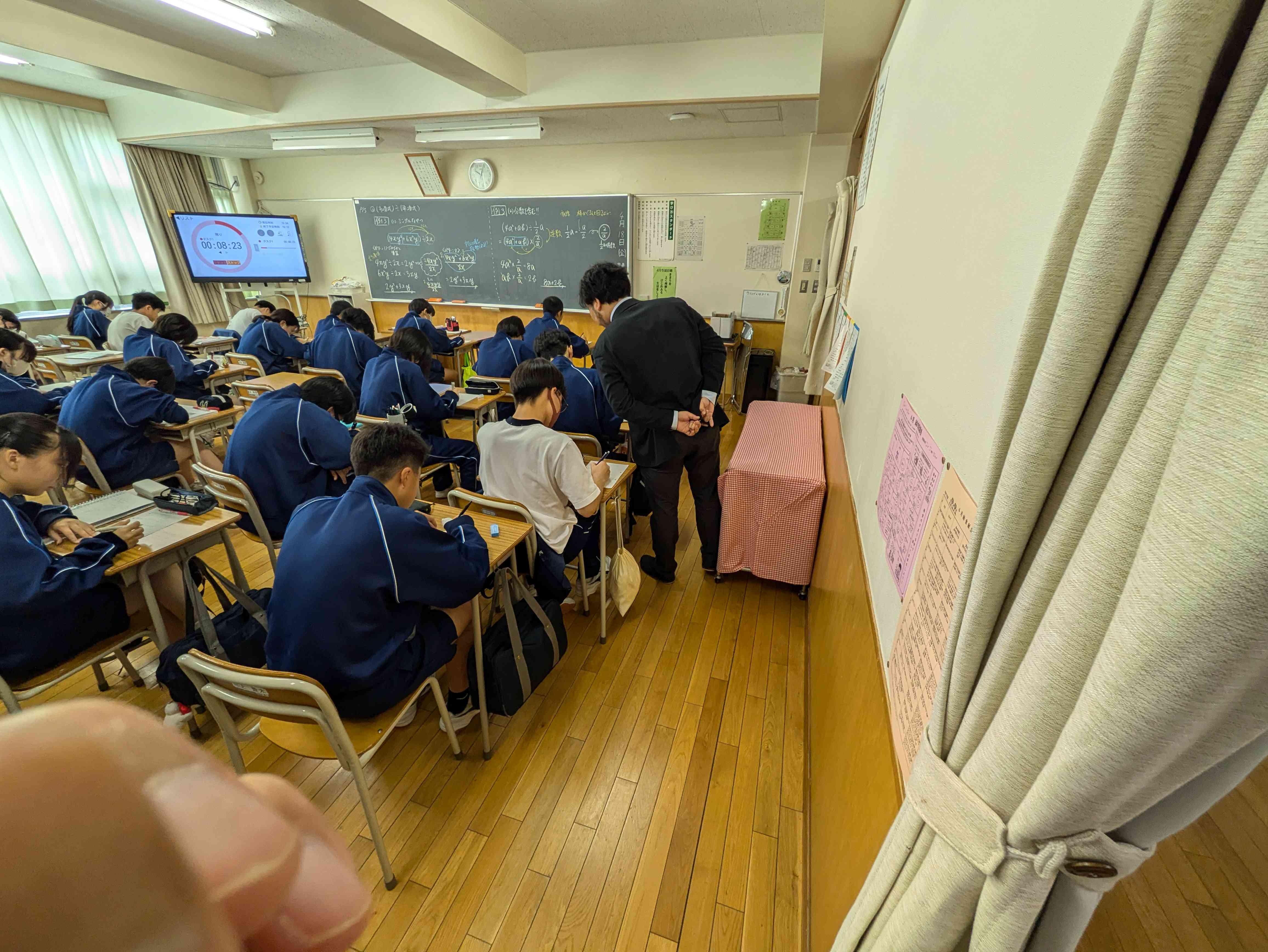 3年生の数学にお邪魔しました。 多項式÷単項式のやり方を説明しています。 シンプルな例題、分数を含む例題をいくつかのパターンに分けて説明しています。わかった生徒に説明させる等しているため、子どもも集中して参加しています。 説明のあとは、演習問題の時間でした。説明がわかりやすかったのか、問題をどんどん解いていました。