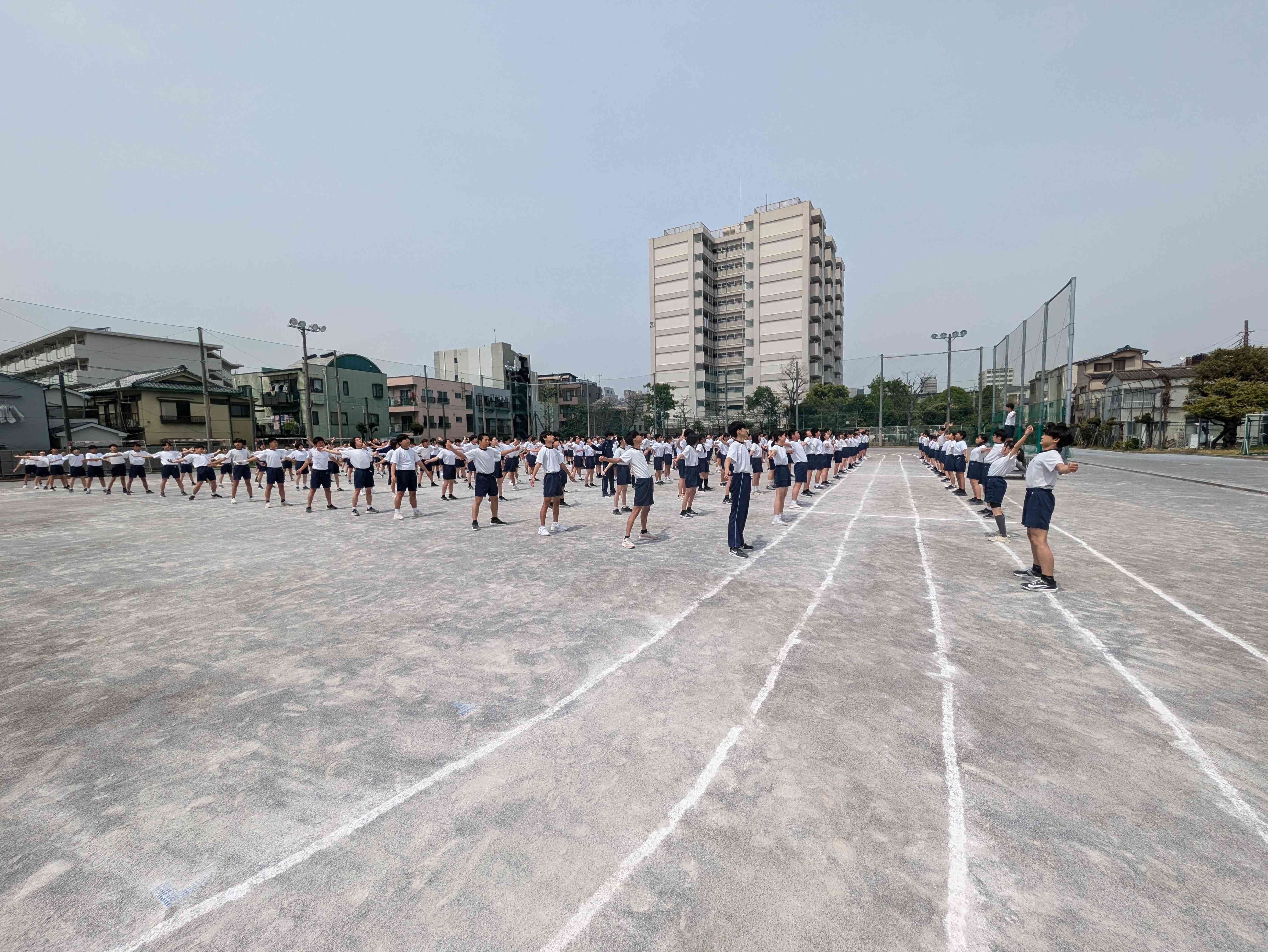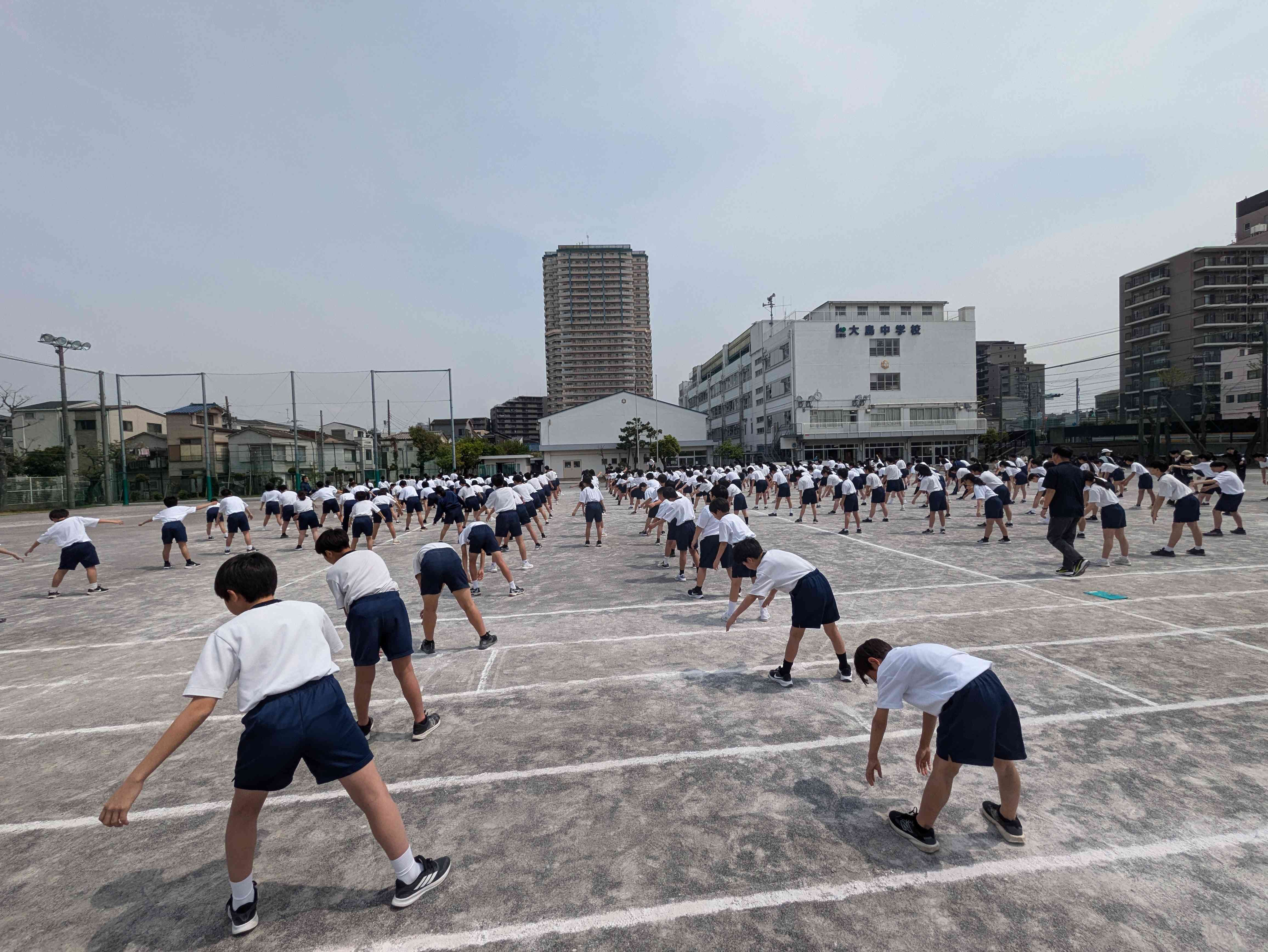 今日はとても良い天気です。 4校時、全校練習が行われました。 全校でのラジオ体操。体育行事委員の指示で綺麗に揃っています。