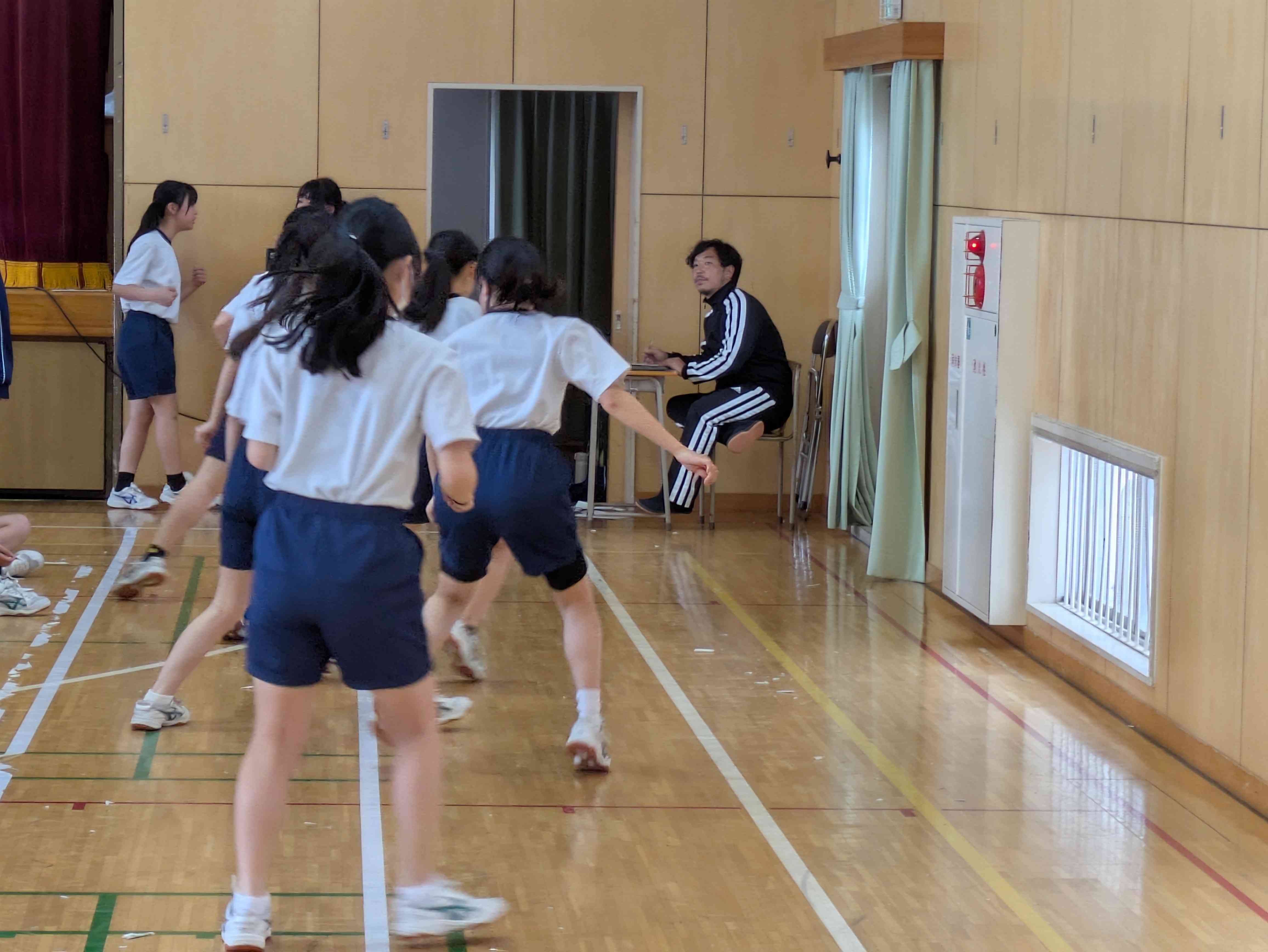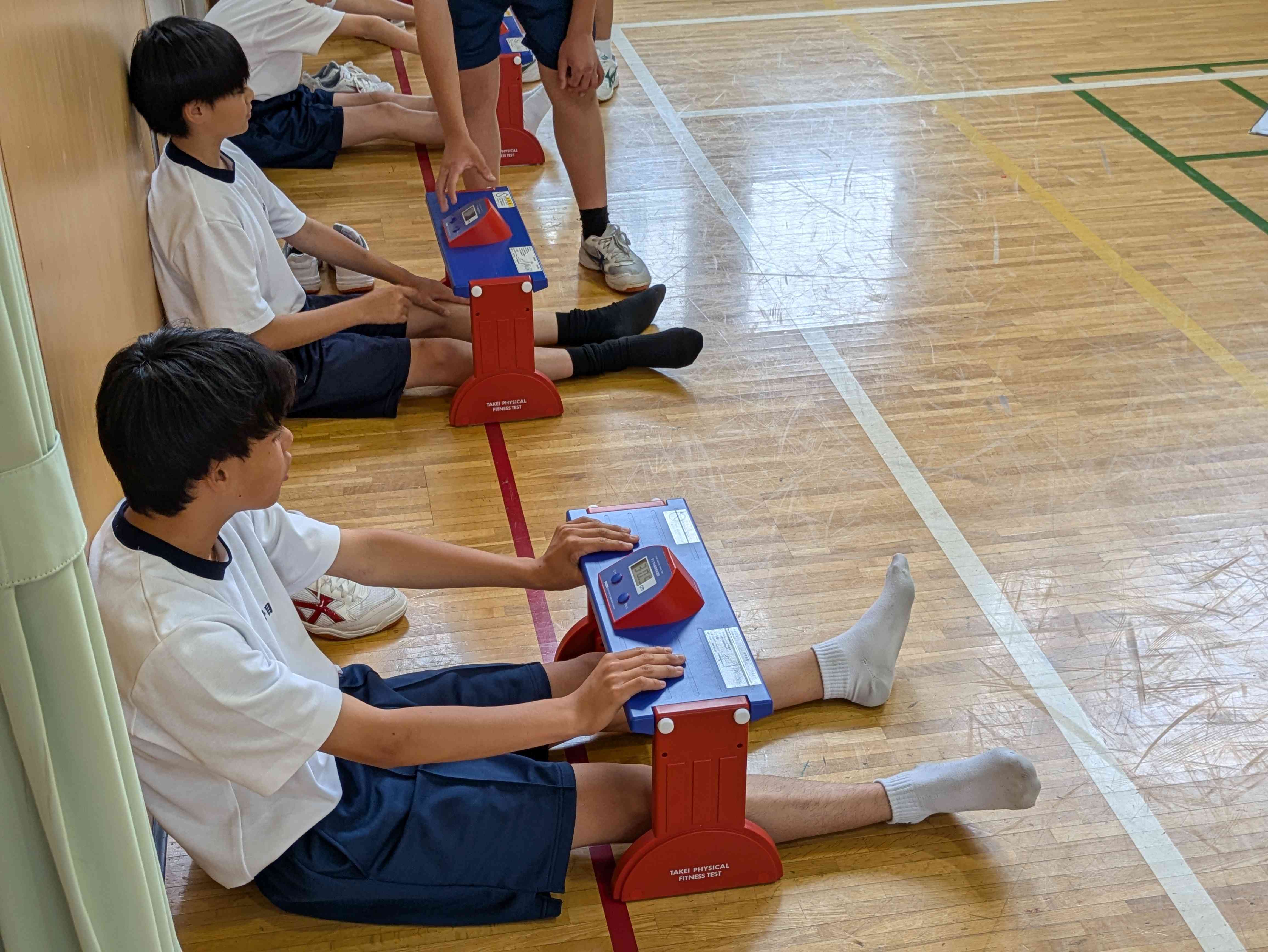 体育の授業では、新体力テストが行われました。 写真は、反復横とびと長座体前屈の様子です。 一度にたくさんの生徒が実施するため、一人一人がやり方を理解すること、ペアがしっかり伝えてあげることが重要です。 みんな集中して取り組んでいました。