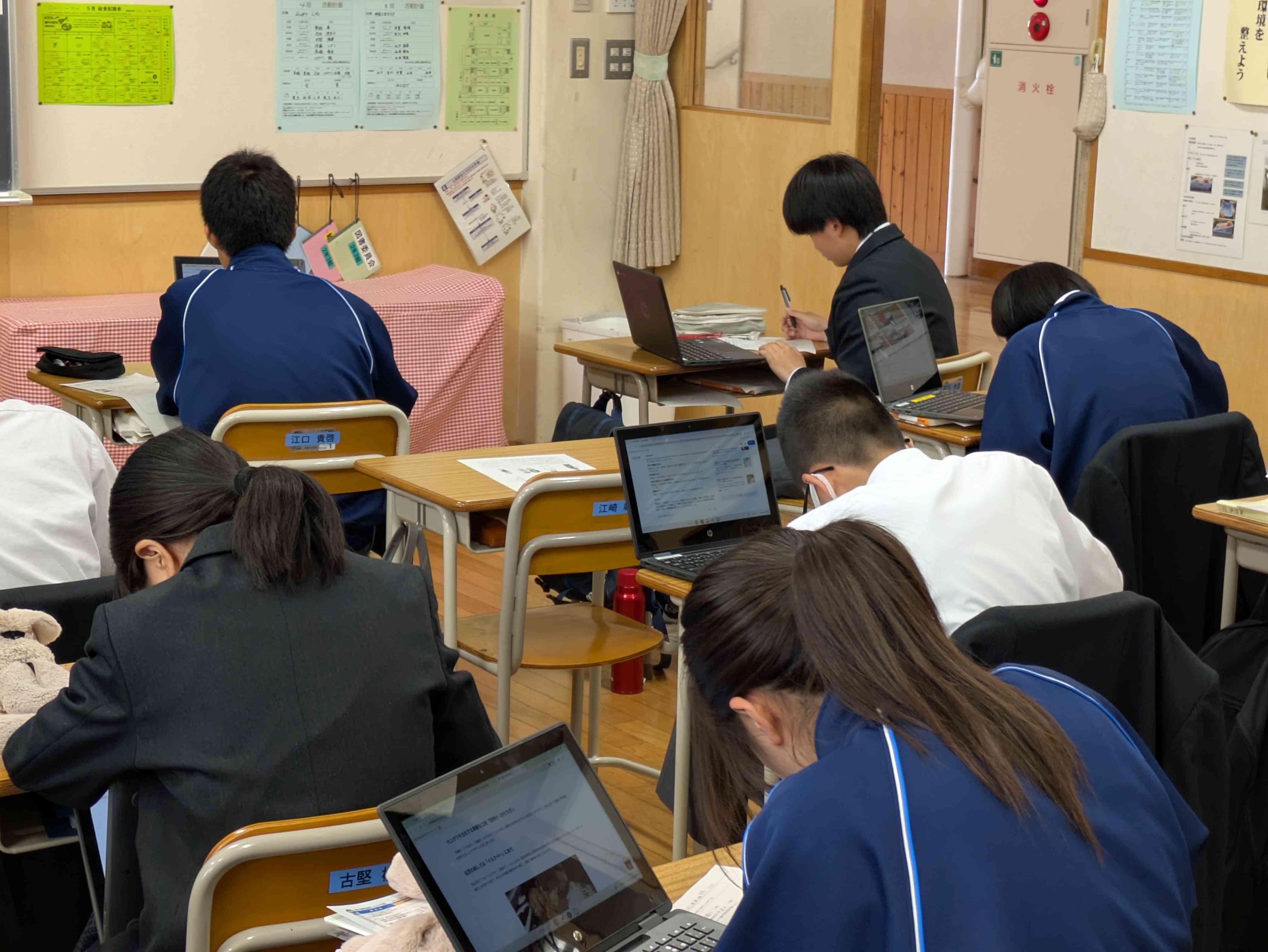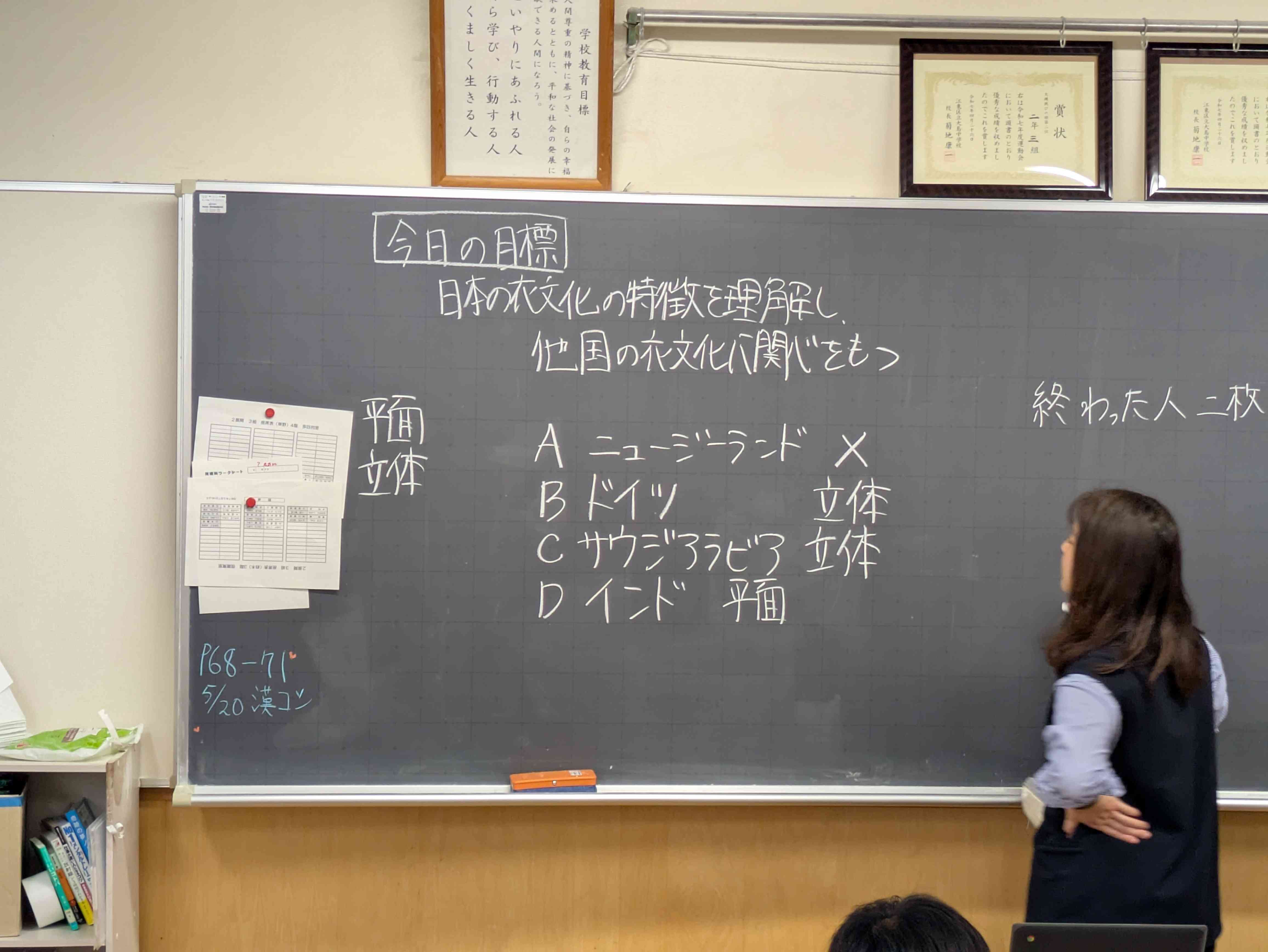 日本の衣文化の特徴を理解し、他国の衣文化に興味をもとうという目標が提示されていました。子どもたちは学習者用端末で他国の衣服についてまとめています。