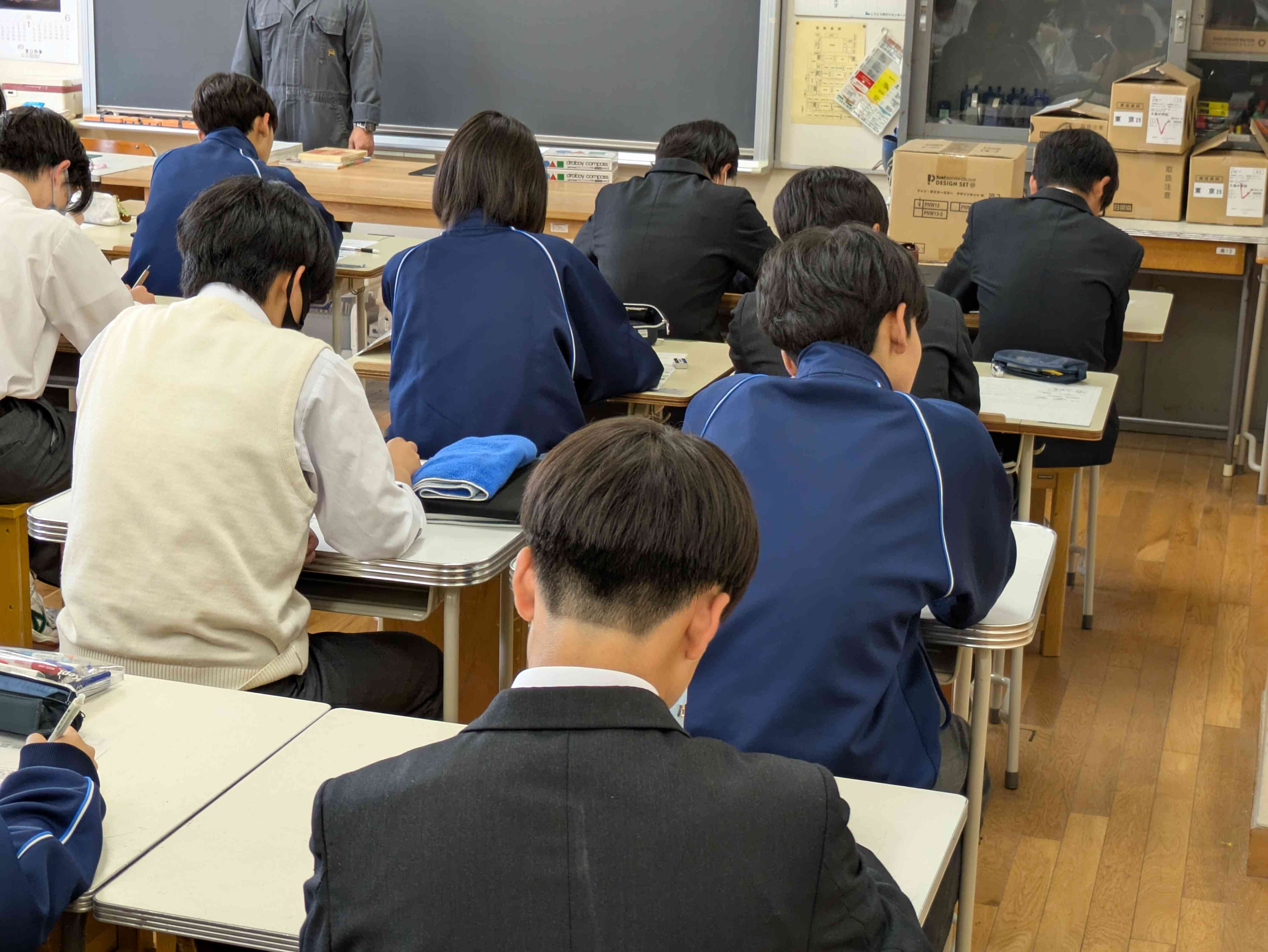 3年生の美術です。 てん刻の説明をしていました。 説明が終わると実技が始まります。 午後の授業なので、説明を可能な限り短くする。という先生の工夫が見られました。どんなはんこができあがるか、楽しみです。