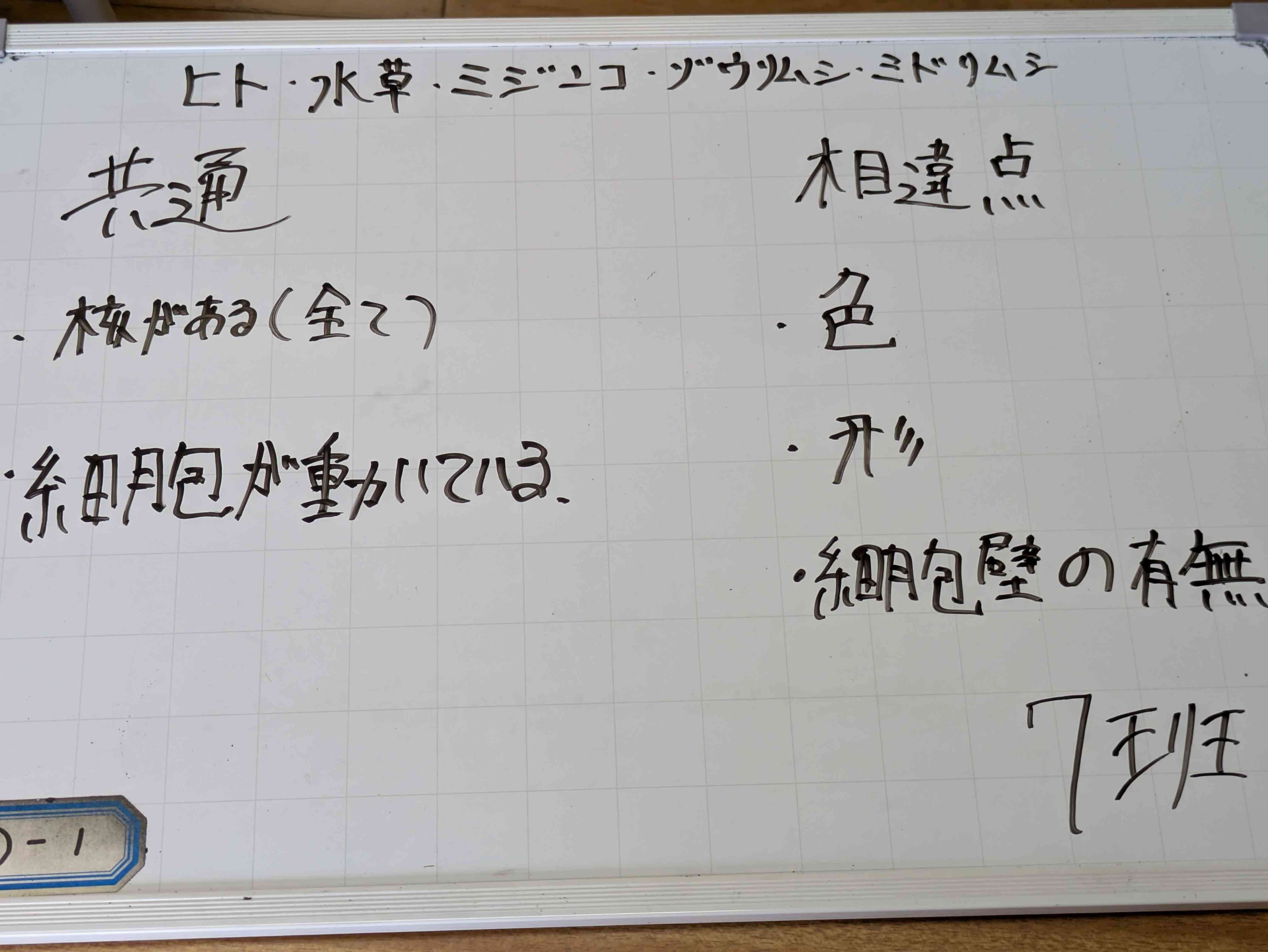 生物のからだは、どのようにつくられているのだろうか。について班ごとに話し合い、発表していました。どの班も(違い)や(特徴)について考えています。 理科的な「見方、考え方」を学んでいる授業でした。