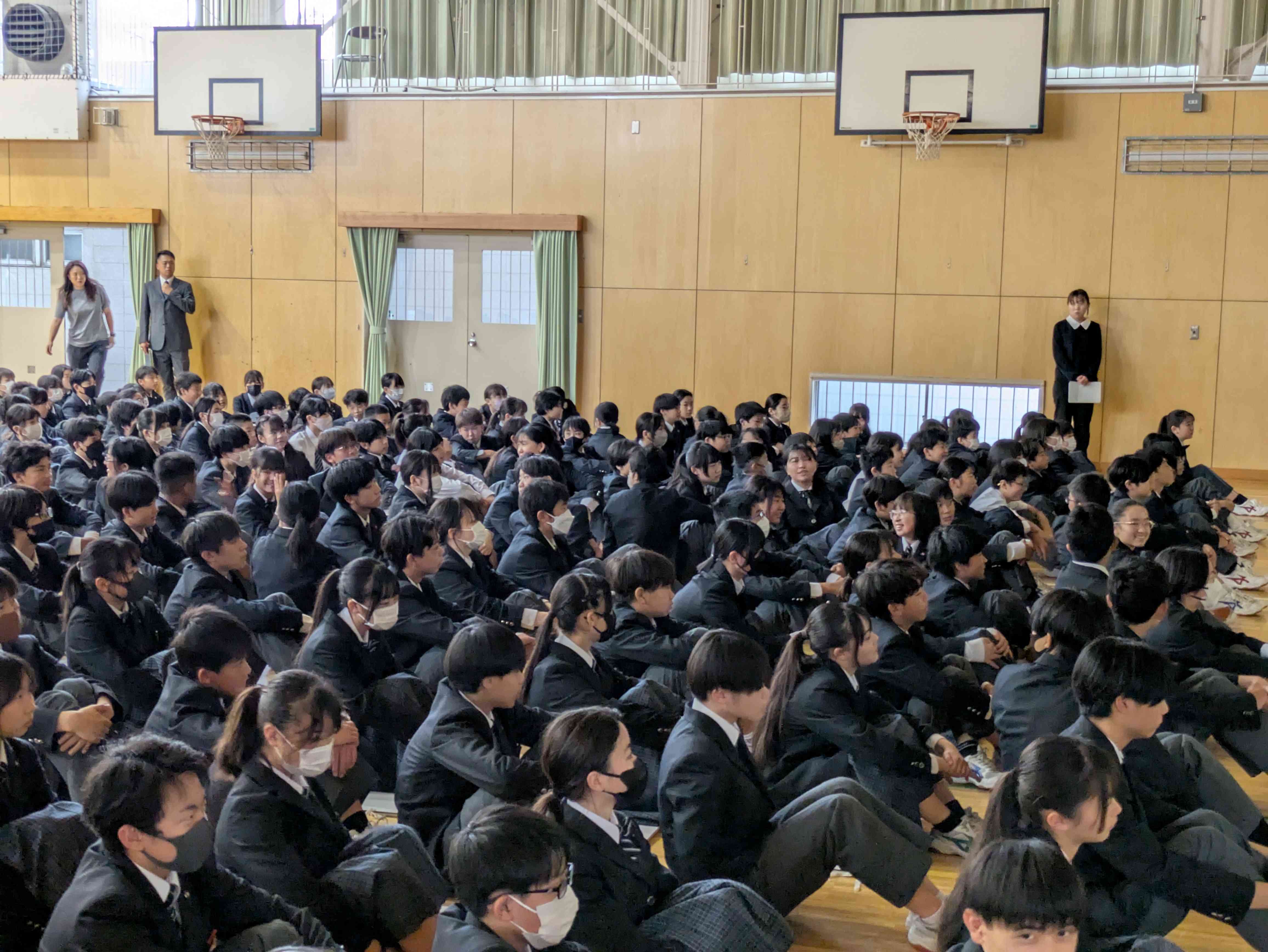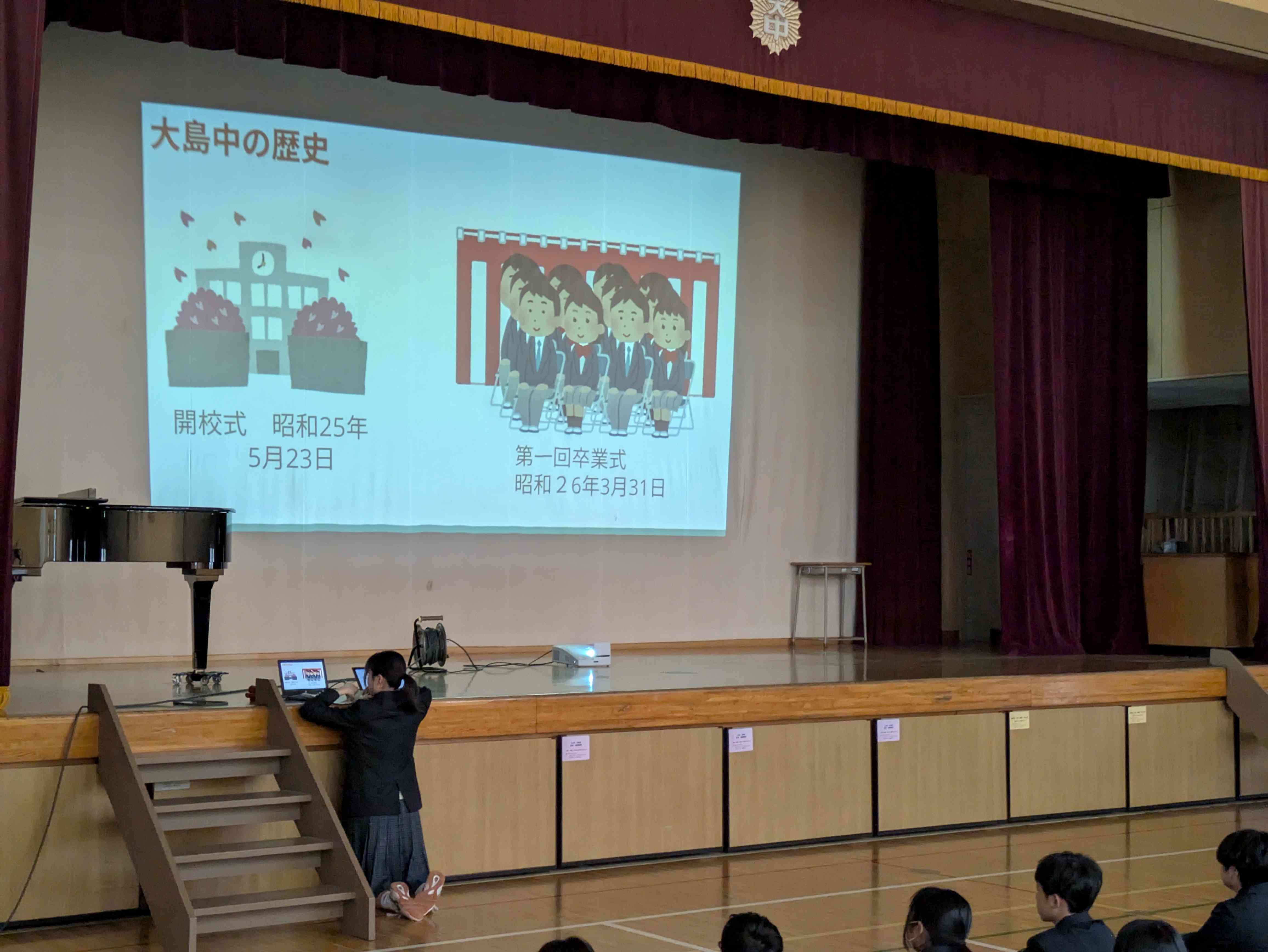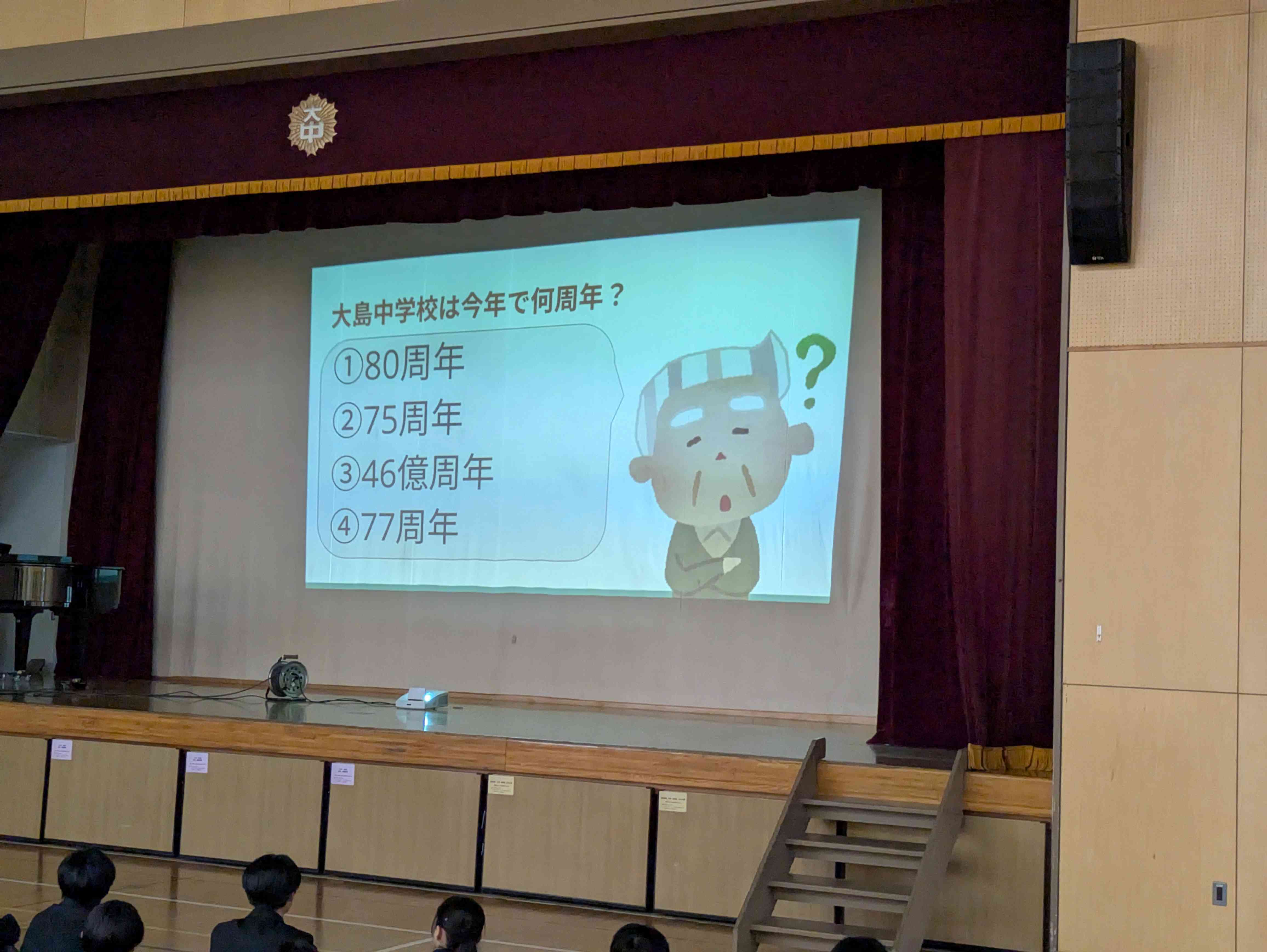 生徒会朝礼では、5月23日の開校記念日を祝って、開校記念行事が行われました。 生徒会役員の生徒が、今日のために、大中の歴史を調べ、クイズを行いました。 司会もとても上手で、朝からみんなのテンションは上がっています。