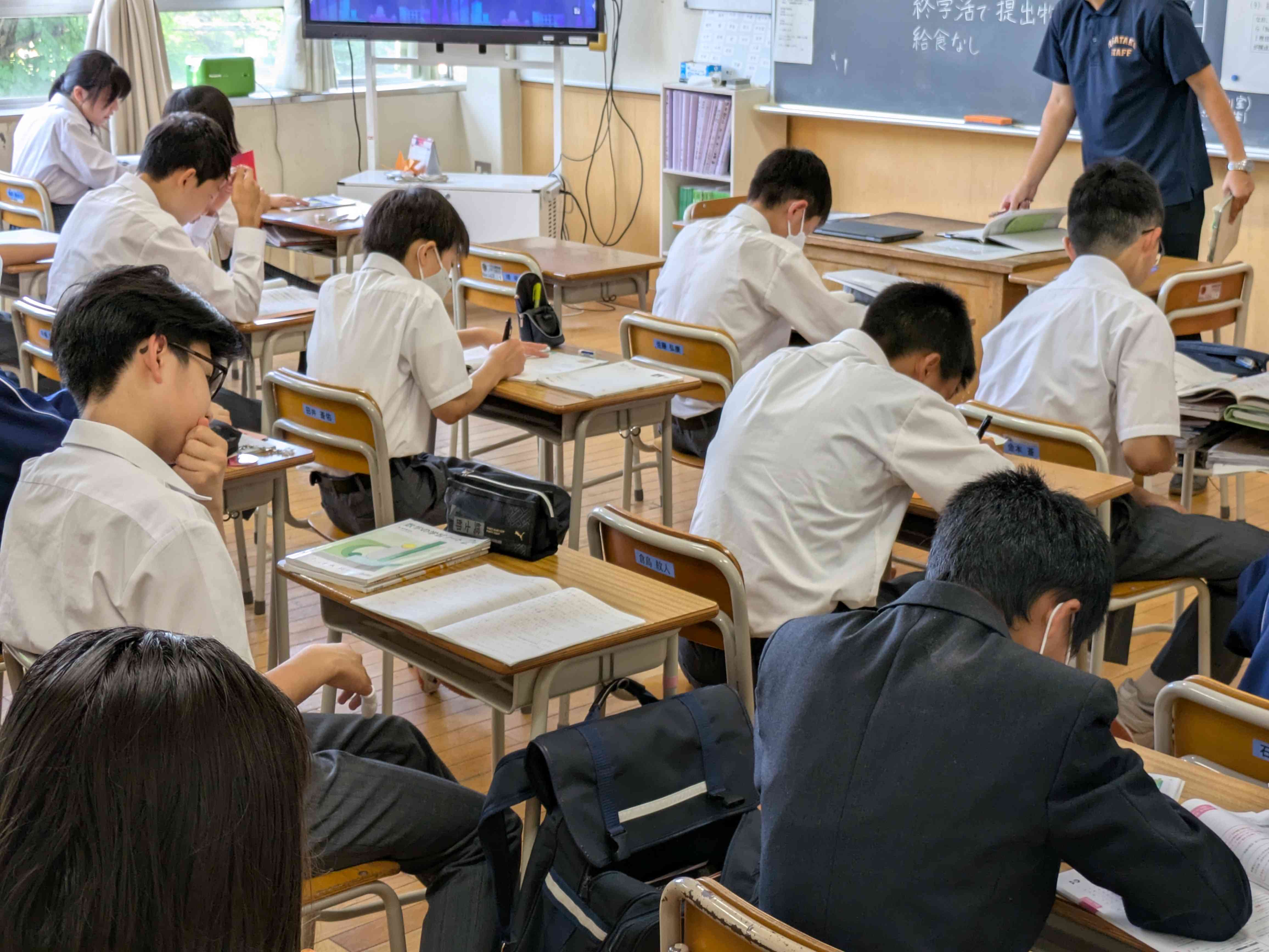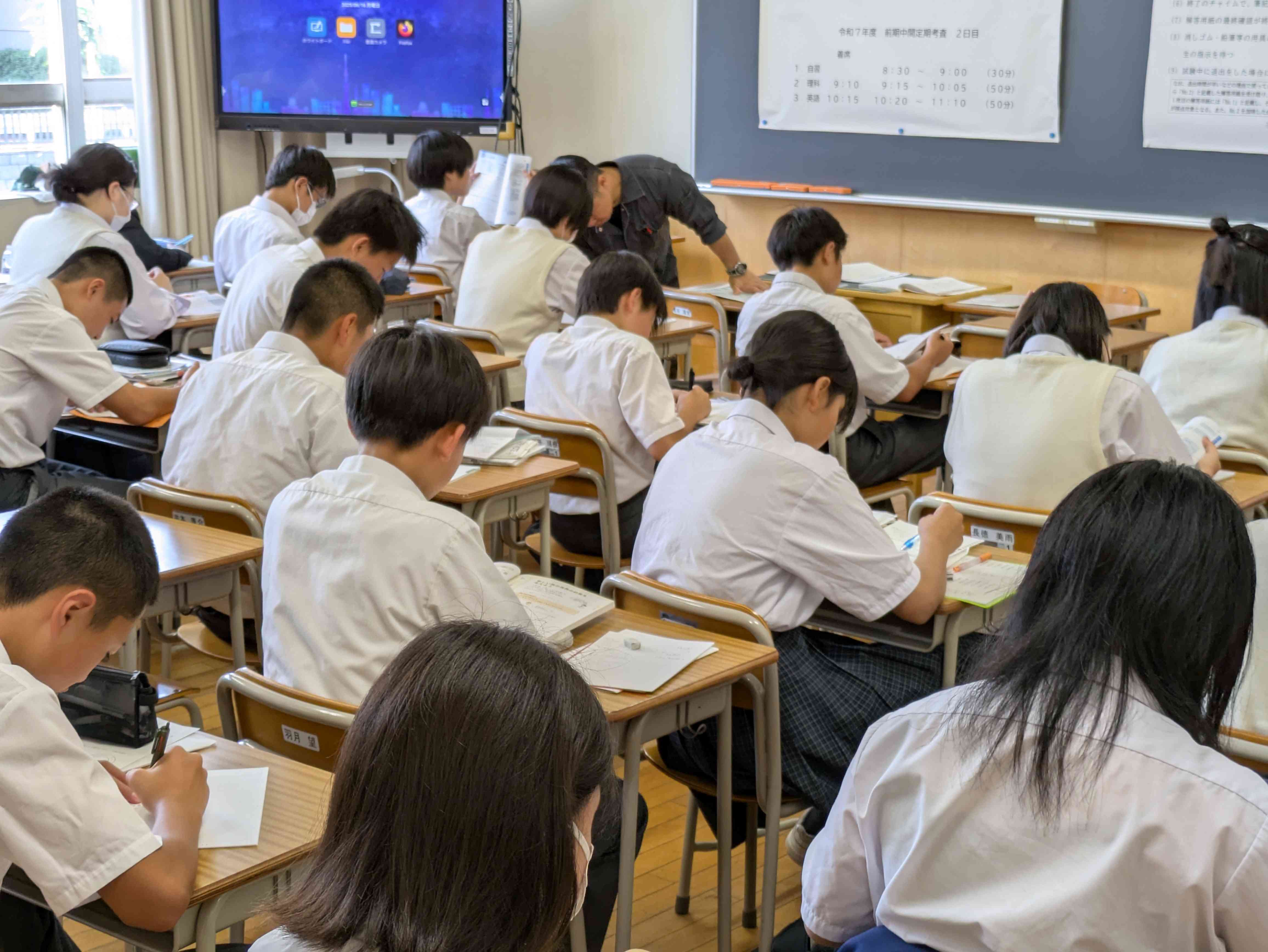 大中は、今日から定期テストです。 いつもなら朝読書に集中している時間ですが、今日はみんなテスト勉強に集中しています。どの学年も同じように取り組んでいました。がんばれ大中生。