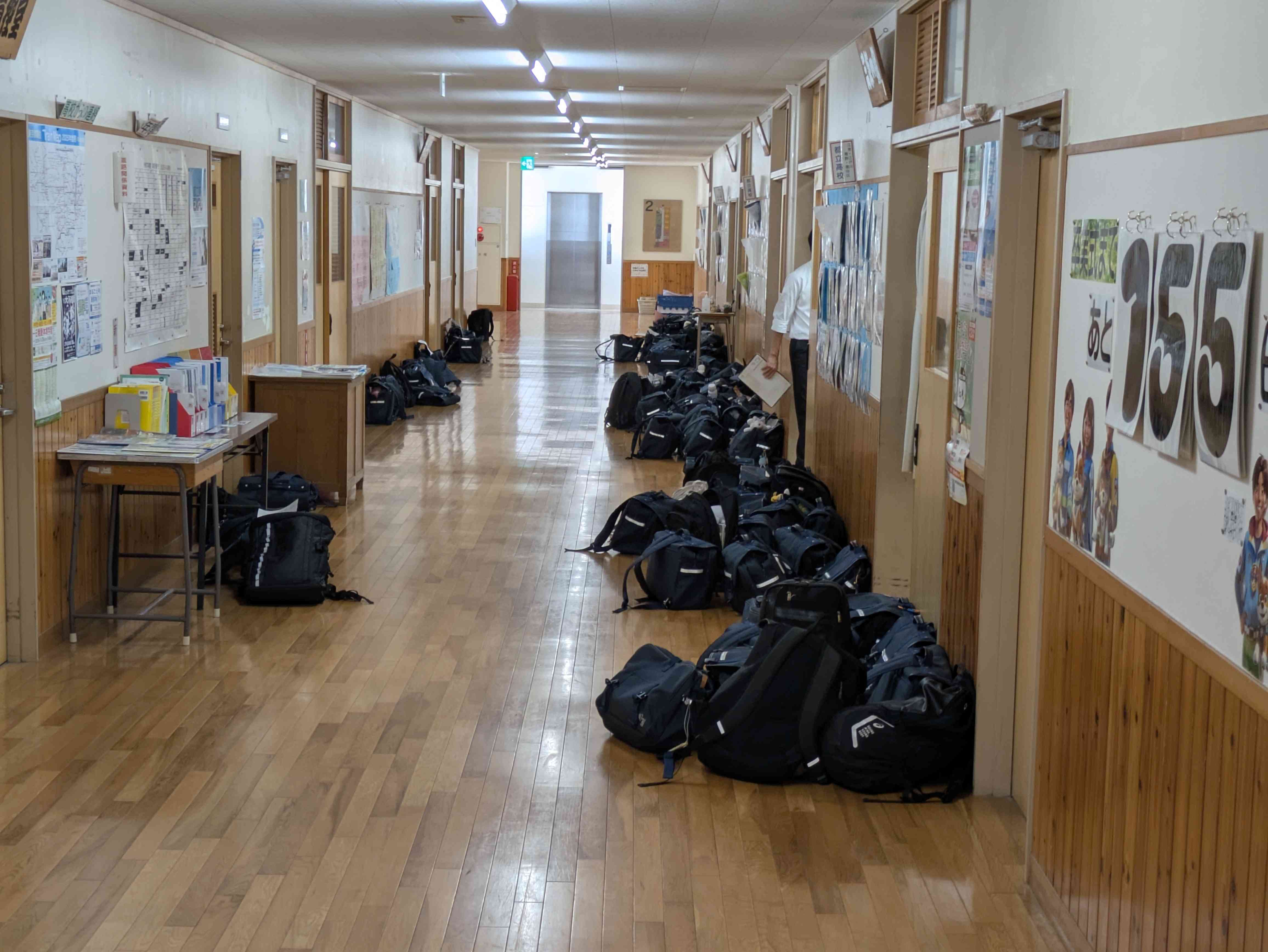 定期テストが始まりました。 テストに集中してもらうため、教室内は撮影しません。 どの学年も廊下に荷物を置き、静かにがんばっています。 学校はとても落ちついています。