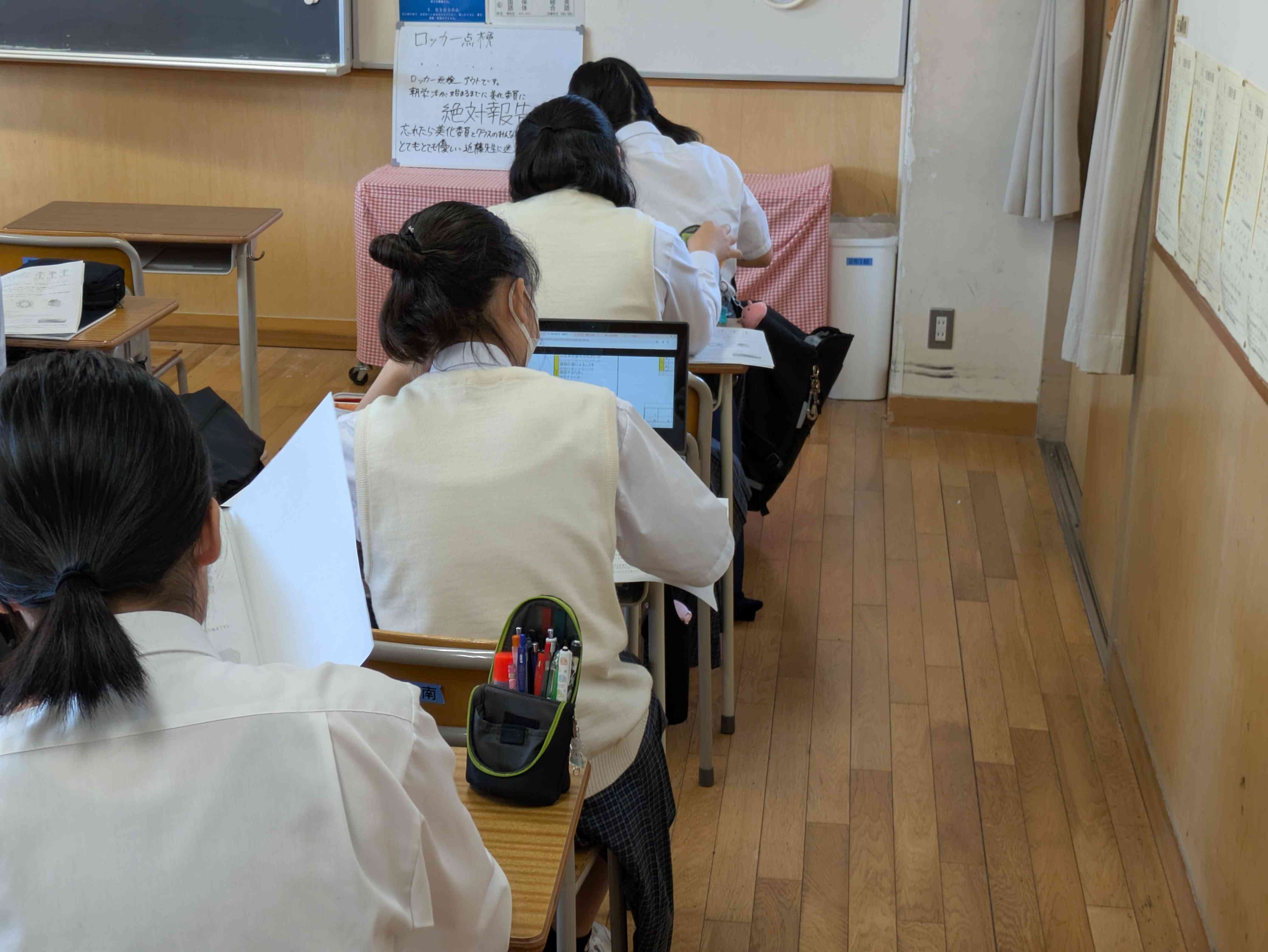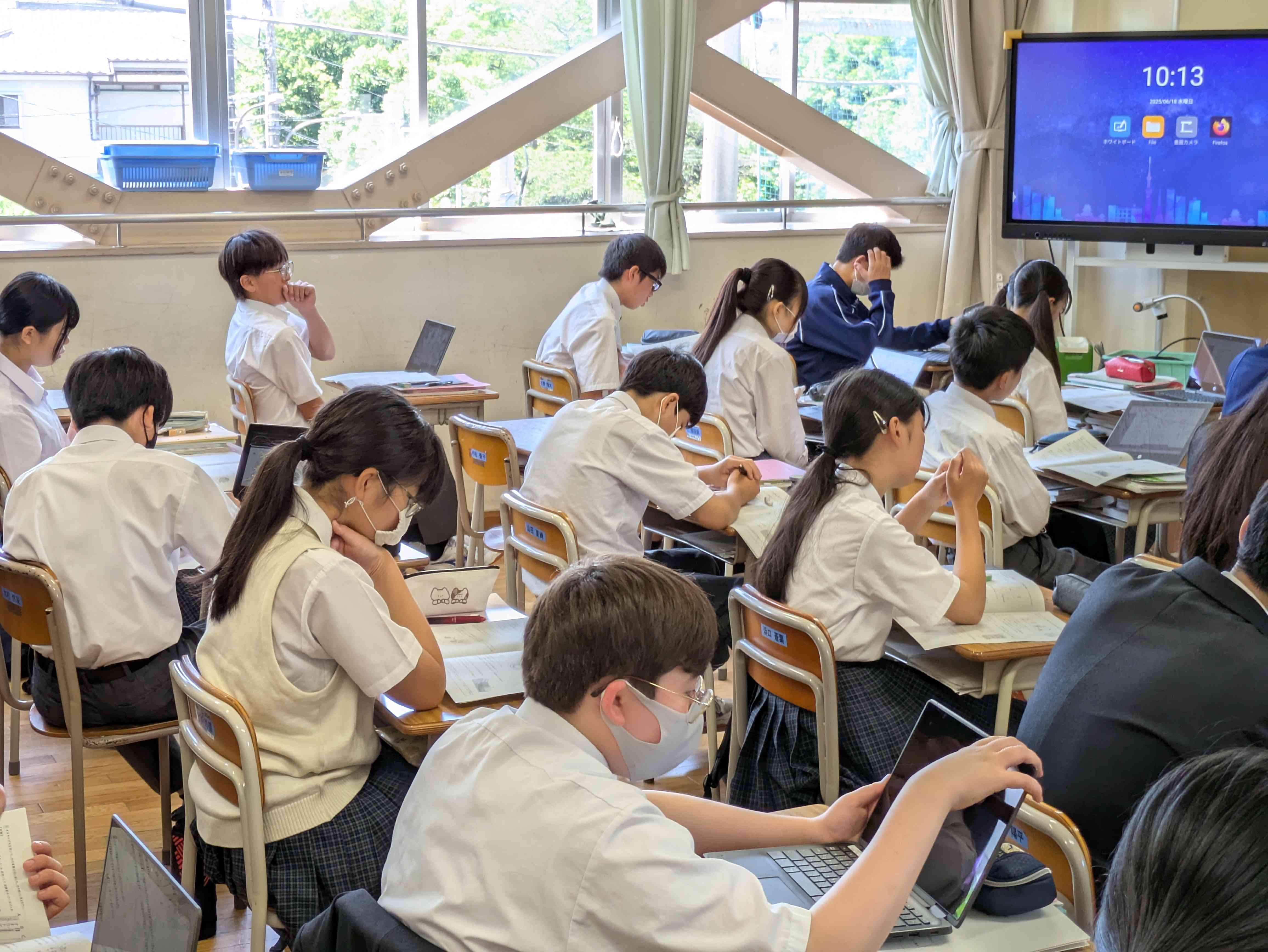 2年生の理科の授業です。 定期テストの答え合わせを行っていました。 タブレットの中にある答案用紙を見ながら、先生の説明に耳と眼をむけています。単に◯か☓ということよりも、何が正しいのか、どうしてそうなるのかというように、理解を深めることが大切ですね。
