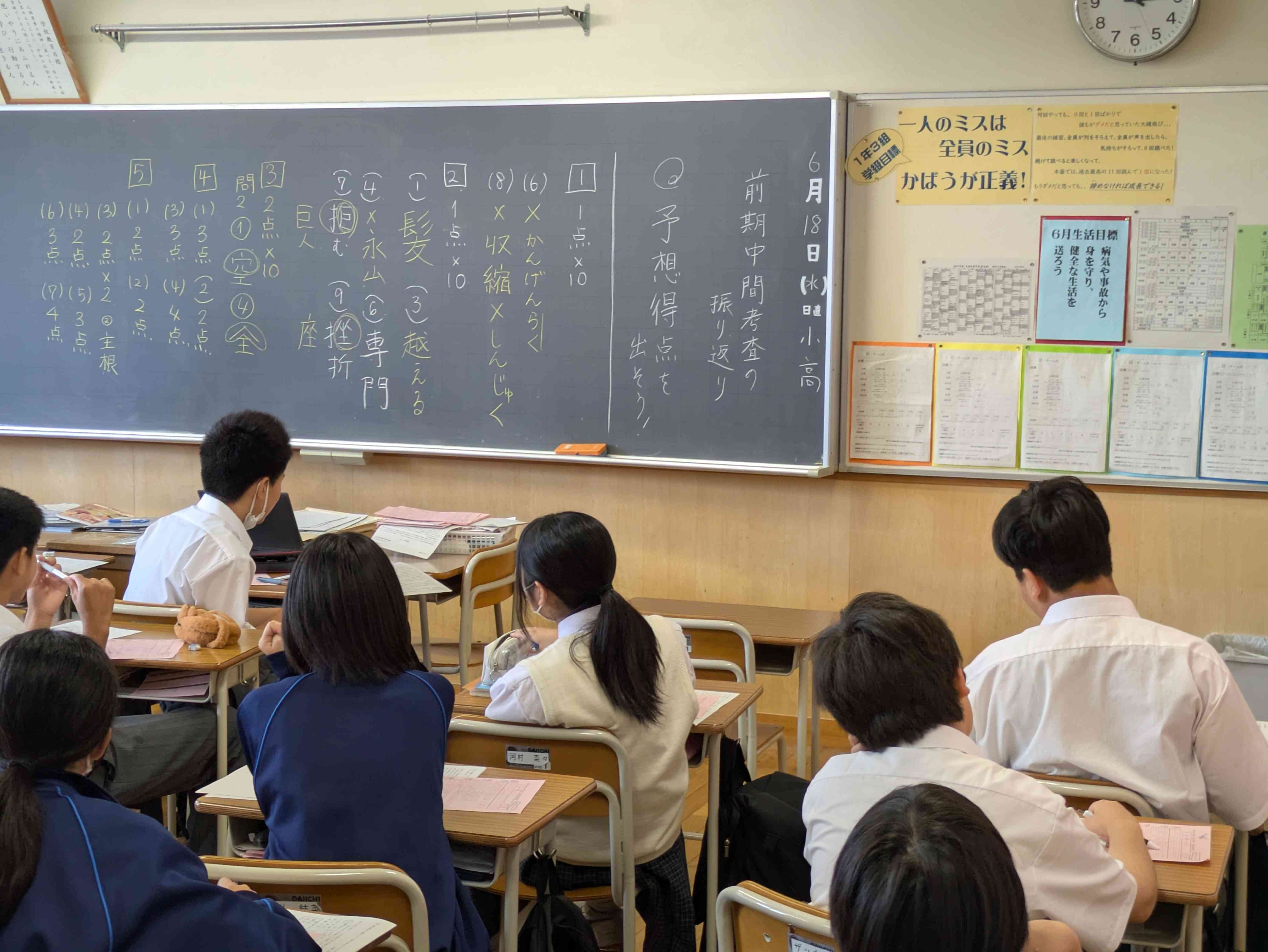 1年生の国語です。 定期テストの答え合わせをしています。 1年生にとっては、初めての定期テストでした。 結果も重要ですが、今回の取組を振り返り、次回のテストや今後の授業に活かしてほしいと思います。