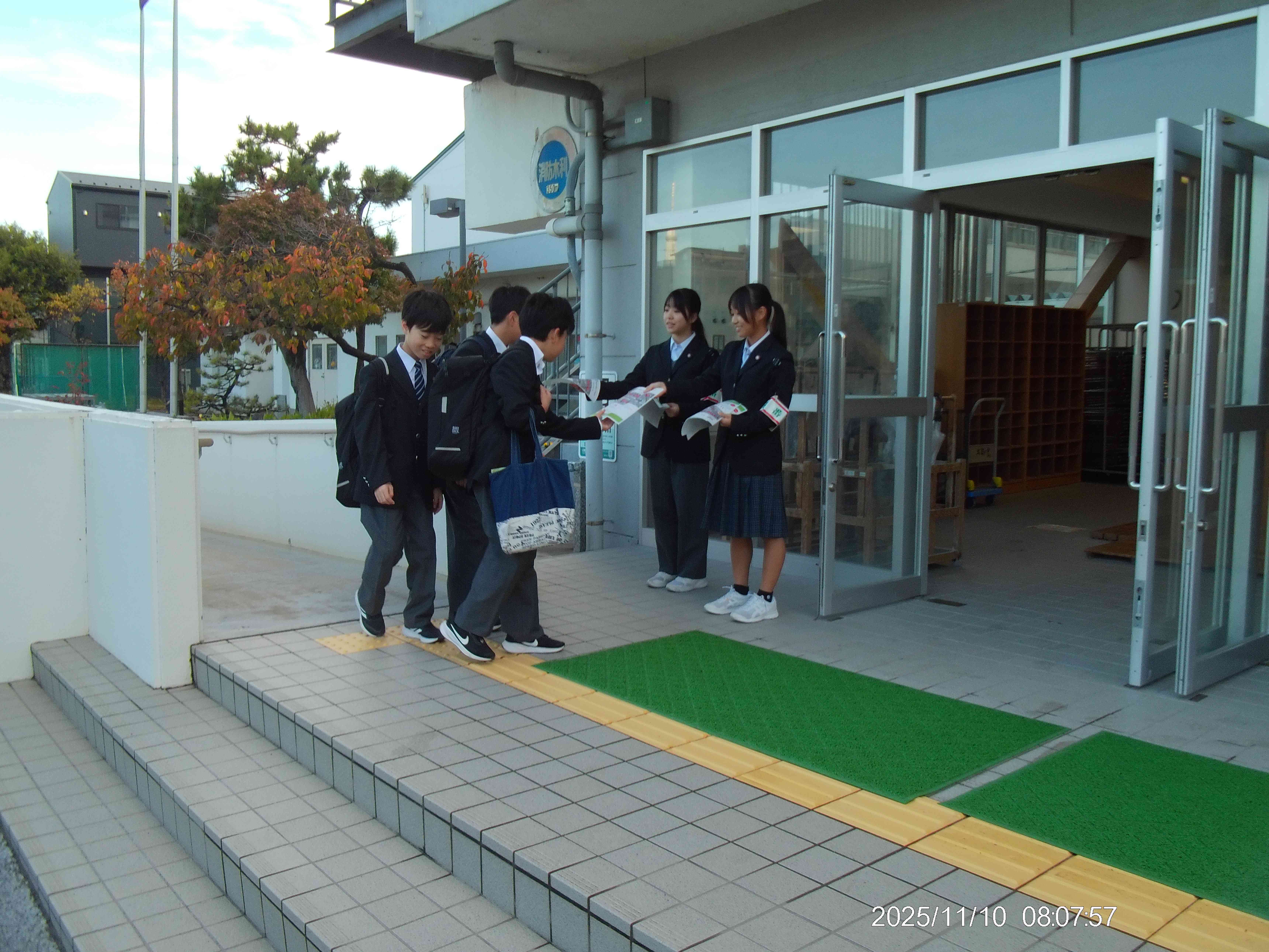 大中では、朝の登校時に挨拶運動を行っています。 11月10日の挨拶運動では、16日に実施する「大中まちキレイプロジェクト」への参加を呼びかけるビラ配りを行っていました。生徒会からの提案での取組です。大中がボランティアの心であふれるそんな学校になるといいですね。